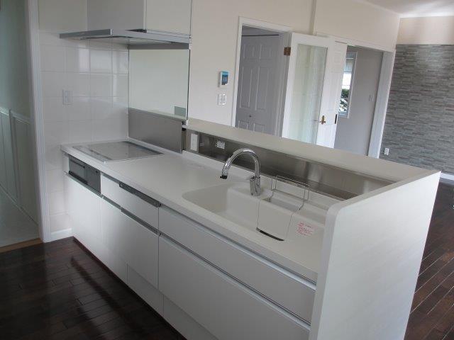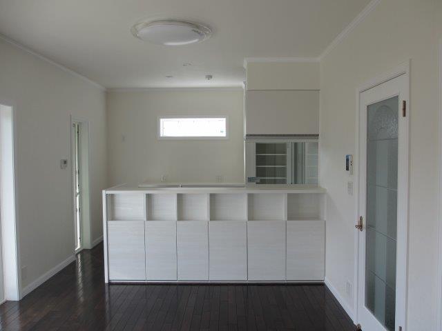 LIXILの対面キッチンユニットペニンシュラⅠ型リビング収納タイプで、キッチン側からは手元収納があるタイプです。