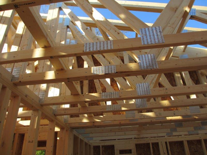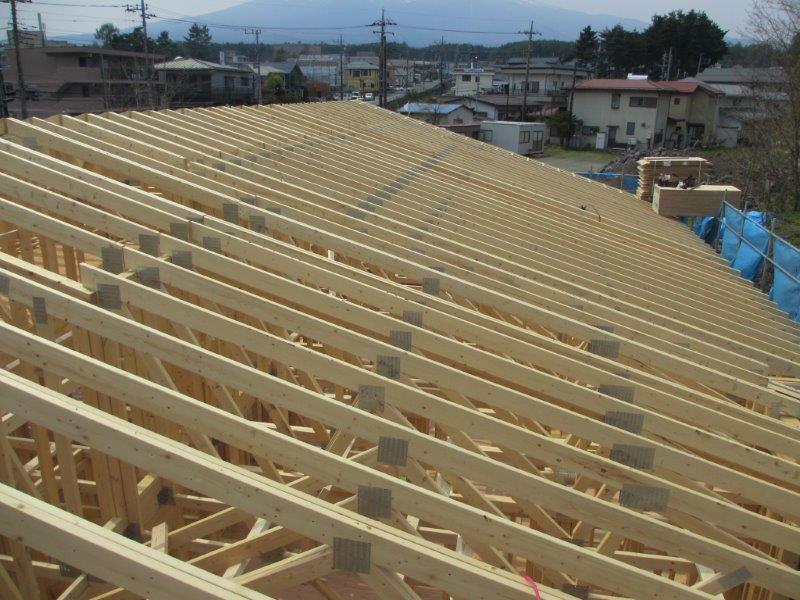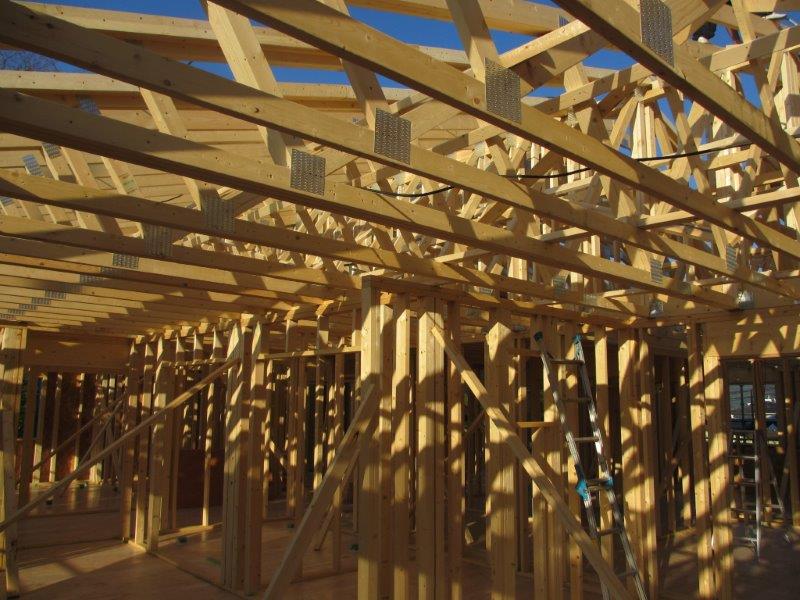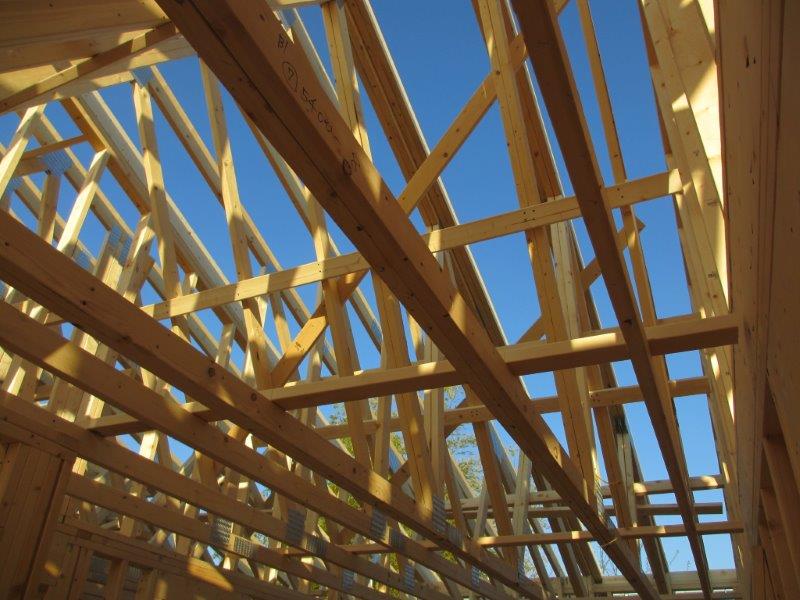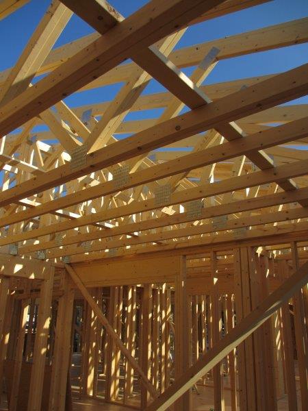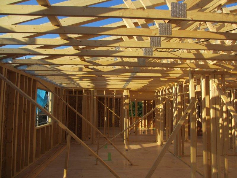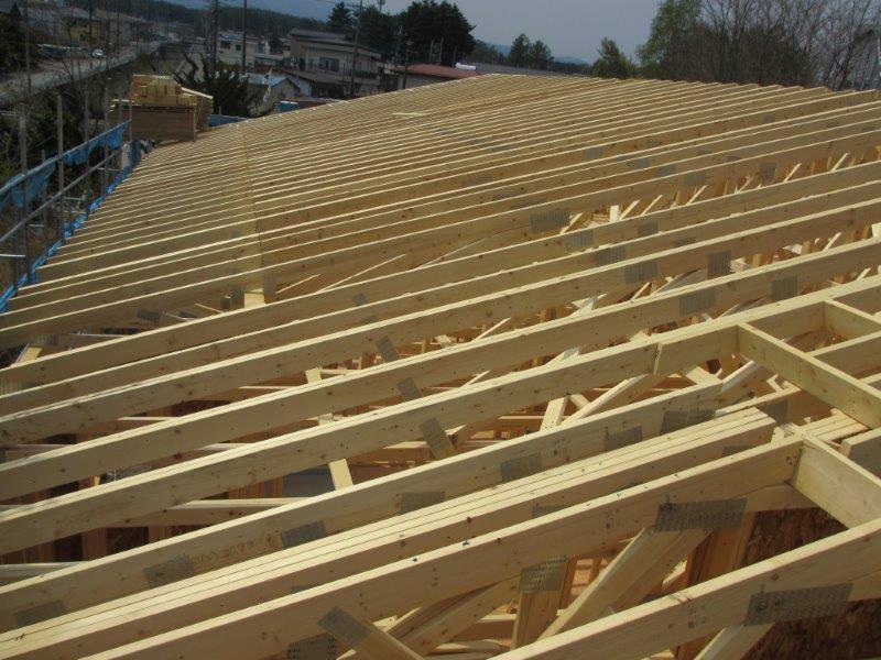 小屋組みは構造材でギッシリですが、部屋は広い空間になっています。