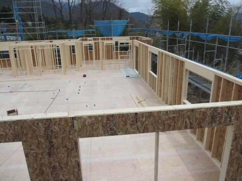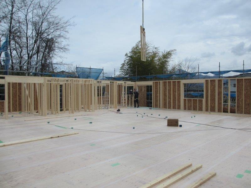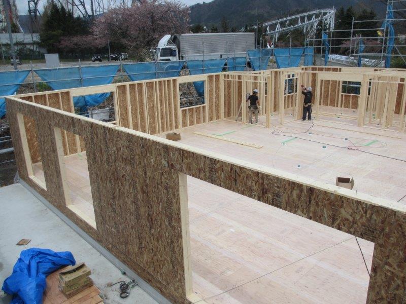 1階壁組み。開口補強の状態を念入りにチェックします。