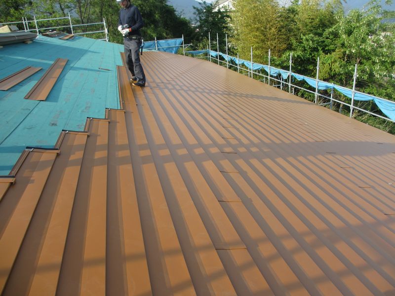 屋根は、カラフルなガルバニウム鋼板 段葺きです。