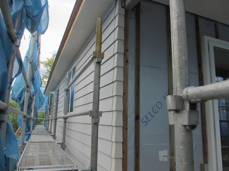 外壁が張り上がってきました。無塗装品の外壁材ですが、この建物は保育園のため、かわいいデザインの塗装をします。